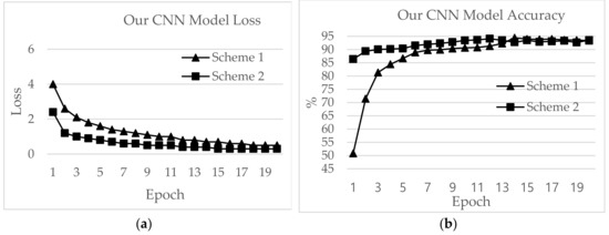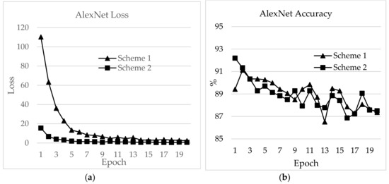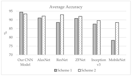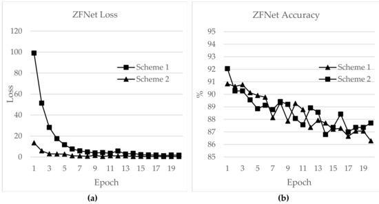 AlexNet performed best in terms of epoch time, with 1.41 and 6.78 min for Schemes 1 and 2, respectively, and test accuracies of 91.12% and 92.19%, respectively. The test accuracies for ZFNet were 90.83% and 92.05%, and the epoch times were 3.54 and 16.47 min for Schemes 1 and 2, respectively. The lowest test accuracy was exhibited by Inception v3, with 87.64% for Scheme 1 and 89.20% for Scheme 2. The epoch times for Schemes 1 and 2 were 4.17 and 20.38 minutes, and the training accuracies were 97.68% and 91.52%, respectively. MobileNet v2 showed epoch times of 4.15 min and 20.32 min with test accuracies of 78.33% and 88.52% for Schemes 1 and 2, respectively.