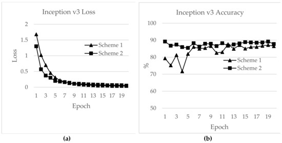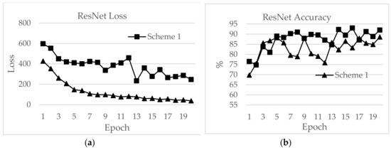 The second highest test accuracy was achieved by ResNet, with 93.00% for Scheme 2. The training accuracy was 96.44%. However, the epoch time was as high as 44.39 min while the loss was 56.54 for Scheme 2. For Scheme 1, the training accuracy was 81.88% and the test accuracy was 88.57%.