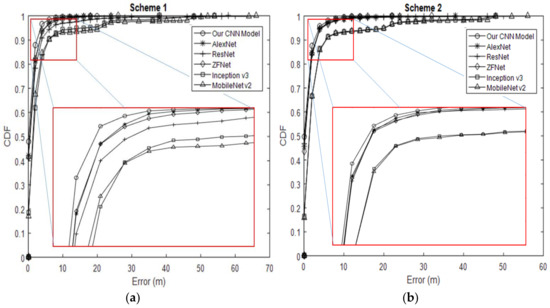Cumulative distribution function (CDF) curves comparing position accuracy for CNN applications with our CNN model. (a) CDF for Scheme 1. (b) CDF for Scheme 2.