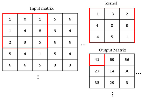 Convolution is the concept of a receptive field in the feature extraction process. It is used by many conventional filters, such as Sobel and Gabor. The convolution kernel is used on the input matrix like a sliding window, as shown in Figure 2. A two-dimensional convolution operation with a moving step equal to 1 is presented in Equation (1):