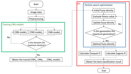 In order to leverage advantages from different CNNs, the integration of multiple convolutional neural network architectures with different optimal methods through the evolutionary fuzzy integral is proposed in this paper. The flowchart of an EFI-CNN is depicted in Figure 3.