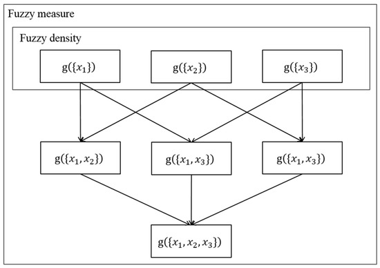 When there is only one element in set X, the fuzzy measure g(X) is called the fuzzy density. Before calculating other fuzzy measures, the fuzzy density must be decided first. In the conventional fuzzy integral, the fuzzy density is set by users based on their experience. In general, the fuzzy density represents the worth value of the outputs in each network classifier. Some studies have used the accuracy of non-training data as the fuzzy density [18]; however, the accuracy of non-training data is usually not the optimal fuzzy density. The relation between fuzzy measure and fuzzy density is shown in Figure 4.