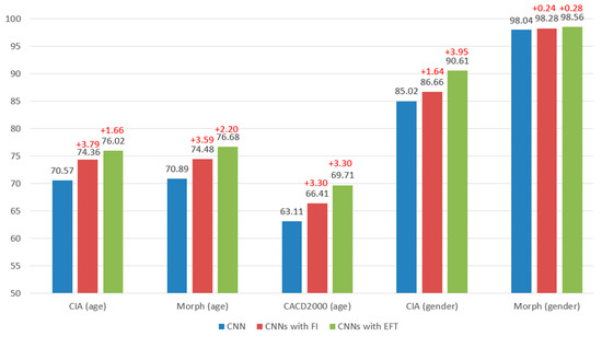 The Morph database is a Western-based face database [27]. It contains 55,000 face photos taken of 13,000 people. Figure 8 displays some photos from the Morph database. The age distribution is between 16 and 77 years old. The average interval between photos of each person is 164 days, and there is no continuous shooting. The data on age ranges and gender are shown in Table 6 and Table 7. Table 8 and Table 9 illustrate the age ranges and gender accuracy in classification of the Morph database using various CNNs. Table 10 illustrates the results of EFI-CNN on the Morph database. From the classification results of age ranges, the different CNN architectures with EFI have a better recognition rate, and the gender classification accuracy reached 98.56%.