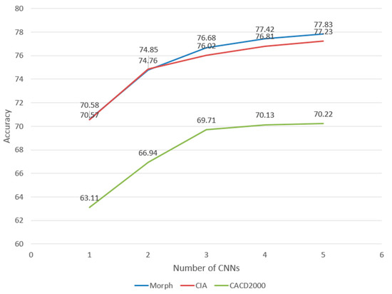 Figure 14 illustrates the accuracy of EFI combined with multiple CNNs. However, combining more than three CNNs does not significantly improve accuracy. This means that we cannot continuously increase the number of CNNs to improve the accuracy of the system, which will greatly increase the demand for hardware.