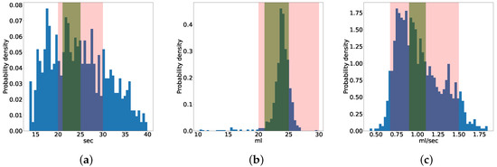 Figure 1 shows the discrete probability density function of the three quality indexes. The pink stripe indicates the domain-based optimal quality range, while the green one indicates the data-driven range. As described in Section 5.2, almost all the experimental samples have volume and flow levels in the optimal domain-based ranges. Data-driven thresholds are more selective and enclose less experimental extractions, especially for the percolation time and flow rate quality variables.