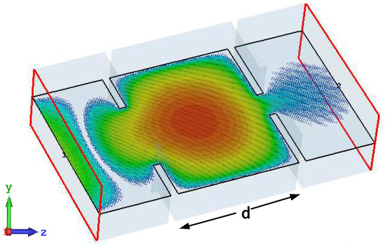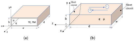 The working principles of microwave filters operating at high frequencies are very similar to those of lumped elements series or parallel resonators in circuit theory [1]. Microwave resonators are constructed by enclosing (short circuiting) both ends of waveguide structures as shown in Figure 1a by metallic walls. For instance, Figure 1b shows the geometry of a rectangular waveguide resonator () with length d shorted at both ends and . Here, it is assumed that waveguide is extending in the z-axis. Electromagnetic energy (in the electric and magnetic fields) is stored within the box enclosure as shown in Figure 2, and it reaches its maximum at good coupling, and it dissipates power in the metallic walls and/or within the filling dielectric material , where is a medium’s relative permittivity.