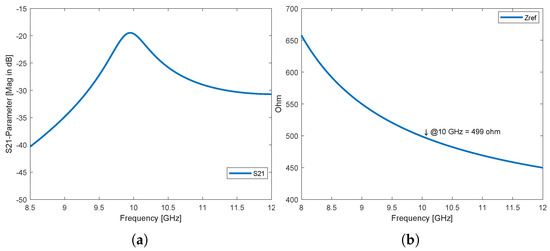where l denotes the number of half-sine (or cosine) variations on the z-axis. Figure 3a shows the parameter of the resonator at 10 GHz resonant frequency when the port 2 in Figure 2 is weak, and Figure 3b shows the real reference impedance to the same resonator at 10 GHz.