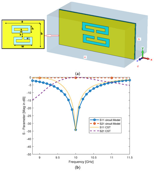 (a) rectangular meta-resonator design; (b) S-parameter response of waveguide meta-resonator and which is compared by using (CST) and a circuit simulator.