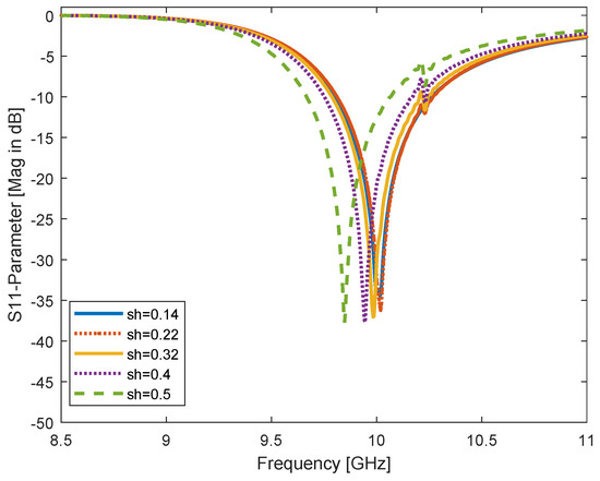 Alteration of horizontal shift between two CSRR rings (upper and lower loops) sh-parameter for sh = 0.14, 0.22, 0.32, 0.4, and 0.5 mm; resonant frequency is shifted to the left once the sh parameter is increased.