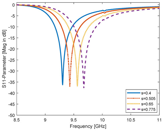 Engraving the center width of both CSRR rings, the s parameter for both loops and its changing s = 0.4, 0.505, 0.65, and 0.775 mm; the resonant frequency is shifted to the right as a result of changing capacitance.