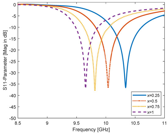 Alteration of both CSRR rings (upper and lower loops) vertical separation, x parameter for x = 0.25, 0.5, 0.75, and 1 mm, and resonant frequency is shifted to the left according to the coupling effect.
