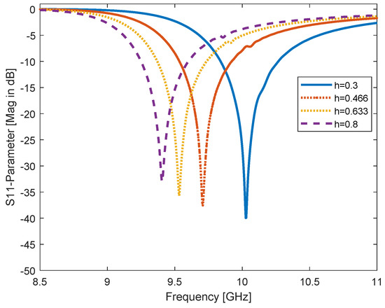 Alteration of CSRR height, h parameter for h = 0.3, 0.466, 0.633, and 0.8 mm, and the resonant frequency is shifted to the left.