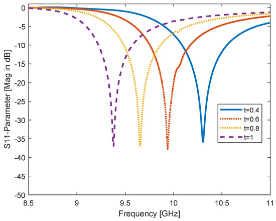 Changing the line width t parameter of both CSRR rings, for t = 0.4, 0.6, 0.8, and 1 mm, the resonant frequency is shifted to the left and the changing is high in frequency according to this parameter.