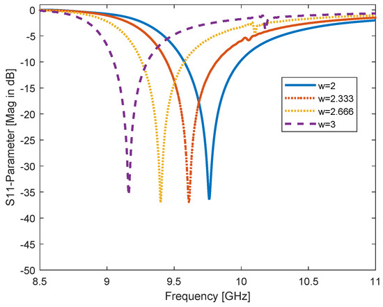 Alteration of CSRR rings width w parameter and its efffect on resonant frequency w = 2, 2.333, 2.666, and 3 mm; resonant frequency is shifted to the left as well as the bandwidth being decreased.