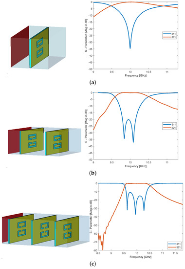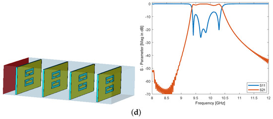 In [34], the authors have designed and simulated a three poles Chebyshev bandpass waveguide filter by using single CSRR in the X-band at center frequency GHz. Although the methodology used in this article is straightforward due to the usage of a single resonator, it gives a narrow bandwidth 500 MHz and is not able to control the bandwidth or the selectivity of filter well; particularly, they have implemented two filters with a different number of poles and given the same narrow bandwidth; furthermore, they didn’t mention the overall physical size of the proposed filter. Whilst the authors in [33] have proposed a unit cell of CSRR and tuned it at GHz center frequency without mentioning the type of filter or the number of filter’s poles, they have just implemented their resonator based on optimization of its physical dimensions to get a desired center frequency with 2 GHz passband. In addition, their method has just depended on the changing physical dimensions of CSRR itself.