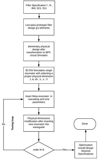 With increasing value of modes (propagation patterns) in the waveguide, attenuation increases as well (evanescent); particularly, the waveguide acts as a high pass filter and supports all possible modes higher than cutoff frequency, but the attenuation losses are minimum in the lower order mode. Thus, assuming that the dominant pattern of propagation is for the cavity, this means that transverse electric or there are no components of electric field in the direction of propagation , and magnetic components exist in the the same direction of propagation . The proposed waveguide filter has the symmetry modeling of resonators, so this feature reduces the number of variables of design (physical dimensions). The structure of waveguide filter, initially used quarter wavelength distance between adjacent resonators. The gap between the inserted metamaterial and the metallic walls of waveguide is less than 30 m. The procedure used here to design the waveguide bandpass filter is proposed in [38], which depends on the coupling between cascaded meta-resonators. The first waveguide resonator is run and optimized at 10 GHz as shown in Figure 4, the initial length of the waveguide resonator without inserting metamaterial is 40 mm and with inserting metamaterial is 17 mm. After that, another resonator has been inserted within the waveguide, or cascaded with the previous one and so on, as shown in Figure 13. Once the overall waveguide filter is totally designed, the initial response is optimized by using an Interpolated Quasi Newton method to reach the desired filter specifications. The flowchart of the filter design procedure is shown in Figure 14. It is noticed that, at 10 GHz, the return loss is the lesser of dB with insertion loss being close to dB, cutoff at dB, and Q factor is 7563 as shown in Figure 15 and Figure 16.