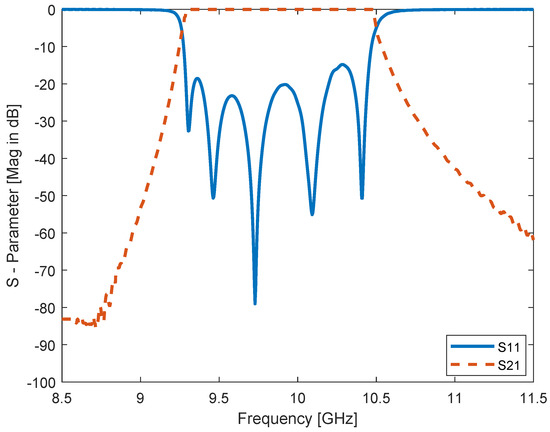 Unlike the conventional filters, the proposed filter is designed based on the metamaterial resonators’ technology that are coupled directly without H-plane waveguide junctions between resonators that give the design important factors, especially for telecommunication applications such as compact size, simple structure, and wide bandwidth. Thus, according to these features, the proposed filter could be employed inline with low noise amplifier (LNA) for X-band receiver circuits which works at 10 GHz center frequency ( GHz– GHz) to suppress the unwanted signal band, and waveguide size is critical in such circuits as well [35]. In addition, the proposed filter could be employed inline with X-band power amplifier at 10 GHz center frequency to achieve the maximum power and extend the desired bandwidth [36]. An X-band RADAR transceiver module that works at the same frequency band ( GHz– GHz) could be inserted with high selectivity and a high quality factor [28].