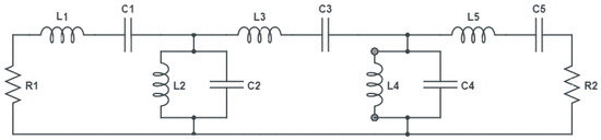 Circuit model of a symmetrical bandpass filter for the Chebyshev response after transformation from low pass prototype filter, , pF, pF, pF, nH, nH, and nH [37].