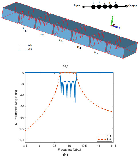 (a) conventional Bandpass waveguide filter with inductive irises fifth order for WR- 90 standard, , mm, mm, and (b) illustration of S-parameters S11 and S21.
