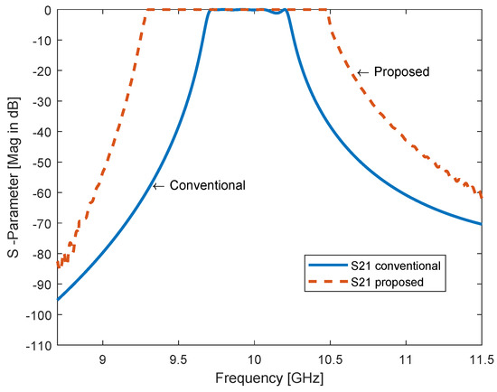 S-parameter comparison between conventional rectangular waveguide filter with direct waveguide junctions and meta-resonator waveguide filter without waveguide junctions for X-band, . The proposed filter has enhanced the bandwidth to as seen in the figure.
