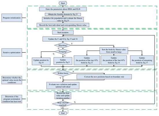 When the particles move to the prohibited operating zone, the positions of particles can be reset to the feasible domain. Through the above operations, it can be guaranteed that the obtained solution always satisfies the running constraint. The flow chart for solving ELD with IBSA is shown in Figure 1.