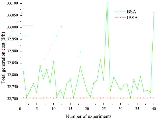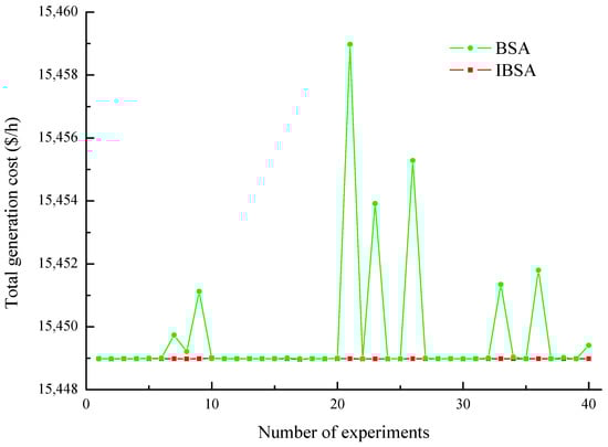 From Table 8, the minimum cost acquired by IBSA is significantly lower than other algorithms including BSA and the error of the power balance equation is at an acceptable level. From Table 9, the optimal value, maximum value, mean value, and standard deviation of the cost of IBSA are significantly reduced compared with other algorithms, which confirms its accuracy and stability. Figure 4 shows the cost of 40 repetitive experiments in Case 2. Clearly, the results of IBSA vary between 32,704.10 ($/h) and 32,703.72 ($/h), which shows its high robustness. The results obtained by the BSA show great volatility. As indicated in Figure 5, the convergence rate of IBSA is much better than the original algorithm, and the convergence curve is smoother. The conclusions obtained in System 2 are consistent with those obtained in System 1, which shows the good effect of IBSA for different test systems.