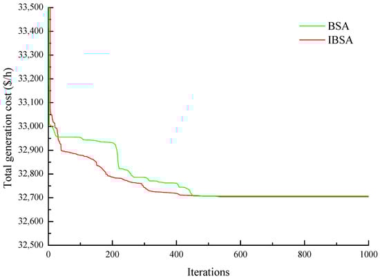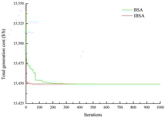 From Table 5, the minimum fuel cost of IBSA and BSA is 15,448.98 ($/h), which is the smallest in all algorithms. In addition, the BSA has the same cost value as the IBSA, which proves the performance of the original algorithm. From the obtained result of power output, the errors of the power balance equations of BSA and IBSA are 0.067 MW. Relative to the load of 1263 MW, the error can be negligible. From the data listed in Table 6, the four indicators of the IBSA are superior to other algorithms and have obvious improvements, especially the maximum cost and standard deviation. Figure 2 shows the fuel cost values with BSA and IBSA in 40 replicate experiments. It can be seen directly that the results with IBSA is small, which varies between 15,449.00 ($/h) and 15,448.98 ($/h). Conversely, the results obtained by BSA are highly volatile. In all 40 repeated trials, the proposed method shows good robustness and stability. Figure 3 shows the convergence curves of BSA and IBSA when obtaining the optimal solution. Compared with BSA, the convergence curve of IBSA is smoother and the downward trend is more obvious. So, the IBSA has better convergence characteristics than BSA. To sum up, the IBSA has better performance and can a generate better solution for ELD.