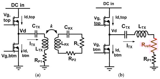However, this zero-voltage switching fails if the reflected resistance (Rrefl) is too high []. High reflected resistance happens when the coupling between Tx and Rx is high at close distance as in Equation (1). This reduces ITX as in Figure 2b. It then takes a longer time for the small ITX to discharge the parasitic drain capacitance of MOSFETs. As a result, the Vd voltage cannot drop to zero before the turning-on of the bottom MOSFET as in Figure 2b, leading to switching loss [,,].