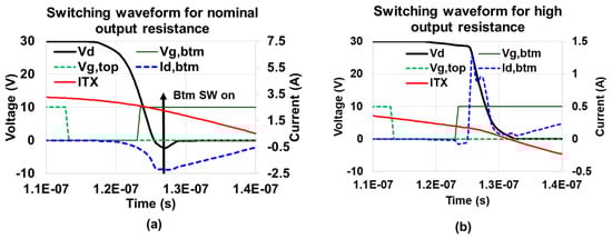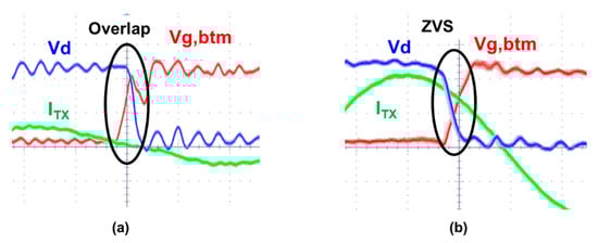 The normal zero-voltage switching (ZVS) waveform of inverter is shown in Figure 2a. After Vg, the upper limit is set to zero and both MOSFETs are off, the coil current (ITX) discharges the parasitic drain capacitors of MOSFETs. This pulls down the drain voltage (Vd) to zero when both MOSFETs are off. After that, the bottom MOSFET is turned on with very low drain voltage (Vd). Therefore, switching loss is small in this case. The MOSFET used in this work is BUK9Y59-60E. Note that although Vg,btm goes up at 123 ns, there is ~6 ns turn-on delay. Actual device turn-on point is approximately 128 ns.