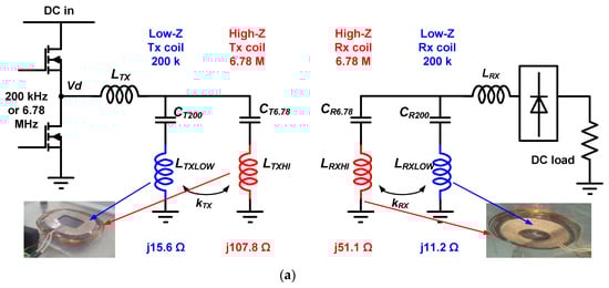 One practical issue is that, because LT(R)XHI and LT(R)XLOW are placed concentrically each other, high coupling between them exists, kTX and kRX. This coupling may cause an eddy current at LT(R)XLOW during 6.78 MHz switching frequency mode. To avoid this eddy current, CT(R)6.78 is designed to be smaller than a value which would completely cancel the LT(R)XHI impedance []. Referring to Figure 3c, phasor diagram, the I6.78 phase is faster than VTX by 90 degree if CT6.78 is chosen to be smaller than a value that resonates LTXHI. From the dot convention and mutual inductance equation, the Veddy is given as , which becomes in-phase with VTX. Therefore, the voltage difference across LTXLOW-CT200 is zero, which prevents eddy current. This allows closer placement of low-frequency coil and high-frequency coil each other than the coils of [].