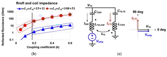 (a) Proposed dual-impedance operation by dual-frequency capability. For low-coupling condition, high-impedance coil paths are activated by 6.78 MHz operation. For high-coupling, low-impedance coil paths are activated. This can suppress excessive variations of reflected resistance which would serve as load resistor of Tx inverter, thus stabilizing the inverter efficiency. (b) The coil impedances are designed such that the reflected resistance is bounded within 1–30 Ω across the whole coupling coefficient k range. (c) Eddy current at LT(R)XLOW during 6.78 MHz mode is prevented by adjusting the magnitude and phase of I6.78, so that Veddy and VTX are the same and the voltage across Low-Z path is zero [].