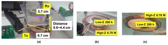 Figure 4 shows measurement setup. The LTXHI and LRXHI are 2.53 μH and 1.2 μH and the LTXLOW and LRXLOW are 12.4 μH and 8.92 μH, respectively. The CT200 and CT6.78 are 55 nF and 130 pF, respectively. The CR200 and CR6.78 are 64.1 nF and 252 pF, respectively.