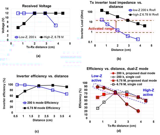 Figure 6a shows the measured efficiency and received voltage for the standalone single impedance system. The standalone single impedance system refers to the conventional single-frequency single-coil system. It is apparent that a single configuration cannot accommodate full distance range. Specifically, low-Z mode is better for 2 cm and below while high-Z performs better above 2 cm. The high-Z mode cannot output the required 12 V because of the excessive reflected resistance seen by the inverter.