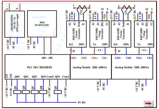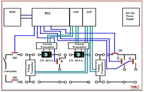 Figure 1 shows the functional block diagram that states the sources and destinations of the digital closing/opening signals (QA: source side closing contact, QC: load side closing contact, QB, QD and QE are load connecting contacts) and current/voltage analog signals (A2D stands for analog to digital converter). The PLC–HMI-based electronics control circuit components and wiring are shown in Figure 2. The hardware and software implementations of the present work are illustrated in the following sections.