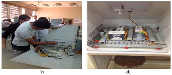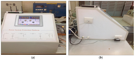 Figure 3 shows the front, left side, right side, and inside of the casing that was designed. The front (Figure 3a) was selected to accommodate the HMI. The left side (Figure 3b) was used to attach an Ethernet socket to provide remote usage and monitoring (i.e., to use the remote control software provided by LSIS Company, such as XP-remote and XP-manager) and also a 13A socket for power service. The right side (Figure 3c) was provided with banana power sockets to allow the user to create his or her own circuits. The inside (Figure 3d) highlights the installed devices.