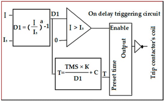 where T is the relay operation time, TMS stands for the time multiplier setting, I represents the current flowing in the relay, Is defines the overcurrent setpoint, and k, a, and c are constants defining the curve. In this work, Equation (1) was translated as shown in Figure 4.