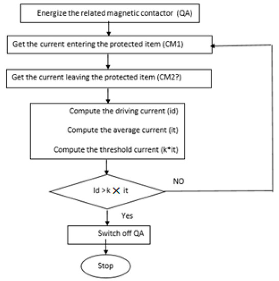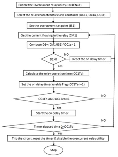 - IDMT over-current relay algorithm:The flowchart for the IDMT overcurrent relay algorithm is shown in Figure 6, in which OC1k, OC1a, OC1c, IS1, CM1, and OC1Td stand for k, a, c, Is, I, and T in Equation (1), respectively. The related PLC-structured text code is listed in Appendix A, Figure A1.