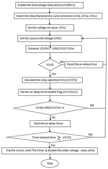 - IDMT over-voltage relay algorithm:The flowchart for the IDMT over-voltage relay algorithm is shown in Figure 7, in which OV1k, OV1a, OV1c, VS1, VM1, and OV1Td stand for k, a, c, Vs, V, and T in Equation (2), respectively. The related PLC-structured text code is listed in Appendix A, Figure A2.