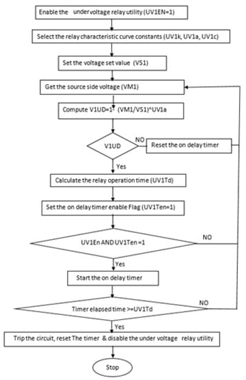 - IDMT under-voltage relay algorithm:The flowchart for the IDMT relay algorithm is shown in Figure 8, in which UV1k, UV1a, UV1c, VS1, and VM1 stand for k, a, c, Vs, and V, respectively. The related PLC-structured text code is listed in Appendix A, Figure A3.