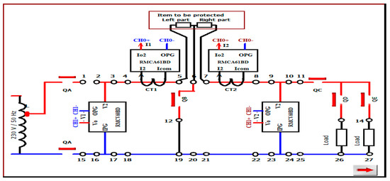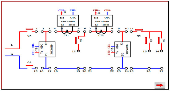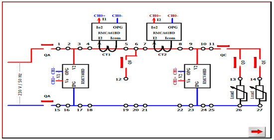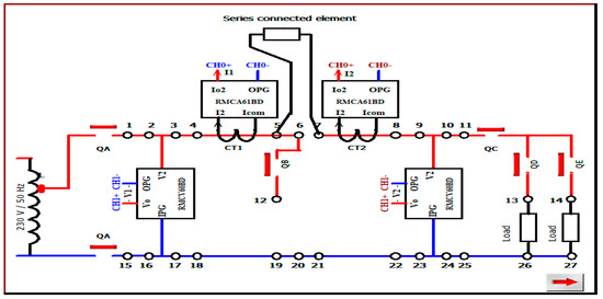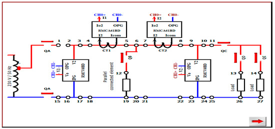 The proposed educational power system’s protective relay platform power circuit wiring points are designed in such a way that the wiring for different protective configurations (overcurrent, overvoltage, undervoltage, and differential protective relays) is as flexible as possible. As can be seen from Figure 11, two core power cables are provided, the cores of which are labeled as L and N, five magnetic-contactor-activated contacts (QA, QB, QC, QD, QE), and 27 banana sockets numbered 1,2…27, in addition to two voltage transducers and two current transformers.