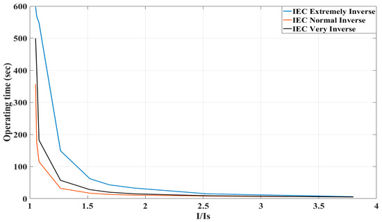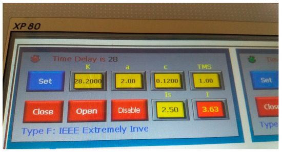 In this context, three tests were carried out: the effect of the relay type selection (see the sample snapshot in Figure 16) on the relay operation time and the relay upgrading test as shown in Figure 17, in addition to the operating time/current responses for the IEC standard settings, as shown in Figure 18. From these figures, Table 2 was derived which states that the adopted relay characteristic curve had an important effect on the relay operation type. Figure 17 shows that with this platform, the teacher can show his/her students the concept of relay upgrading in which the load is protected by two protective relays; the one close to the load takes the role of first line of defense, whereas the second (close to the source) acts as the second line of defense. Figure 18 shows the time/current characteristics for the IDMT overcurrent relay for IEC extremely inverse, IEC very inverse, and IEC normal inverse. The curves were taken with TMS equal to unity. The figure shows that the normal relay had the lowest operating time, whereas the extremely inverse relay had the highest. It also states that for the upgrading condition, the normal one is recommended to play the role of the first line of defense, whereas the very inverse is suitable for the second line of defense.