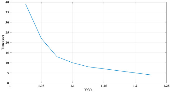 As mentioned earlier, this platform was designed to implement four different types of protective function. Overvoltage relaying is one of these functions. Figure 19 shows a snapshot of the real-time operation of this platform under this mode of operation. Figure 20 displays the time–voltage response for k = 1, a = 1, and TMS = 1. From the curve, it is clear that as the operating voltage increased above the setting voltage, the operating time reduced in an inverse manner.