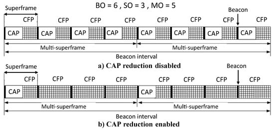 The network time is divided into multiple beacon intervals, each one containing  multi-superframes. Each multi-superframe is divided, in turn, into  superframes. The parameters BO, MO and SO (named Beacon order, Multi-superframe order and Superframe order, respectively) are configurable. Each superframe, as it is shown in Figure 1, includes the beacon slot and two sections for data transmission, i.e., the Contention Access Period (CAP) and the Contention-Free Period (CFP).