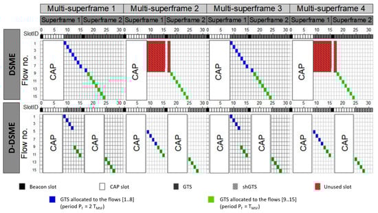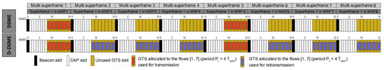 Motivation. In DSME, each GTS within the multi-superframe can be assigned to at most one flow. If the flow period is longer than the multi-superframe period, bandwidth waste occurs, as some of the GTSs reserved to the flow will not be used. Moreover, the rigid structure of the multi-superframe impairs scalability [], because in DSME the number of superframes can be set only to powers of 2 (i.e., 1, 2, 4, 16, and so on). As a result, the multi-superframe length exponentially grows, and, with the CAP reduction enabled, this results in a low CAP frequency (i.e., one CAP every multi-superframe) and, therefore, in high delays in the transmission of the aperiodic messages. A preliminary approach to cope with the DSME scalability problem is addressed in the work [] which, however, provide neither a detailed design of the approach nor an extensive performance evaluation. In addition, the work in [] does not address the DSME reliability.