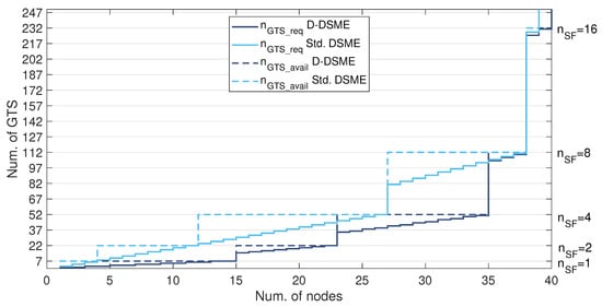 To assess the scalability, a network with star topology was simulated using Algorithm 1 implemented from scratch in Python. Each node periodically transmits to the PAN-Coordinator two kinds of real-time messages ( and ) with periods equal to  and , respectively. In this assessment no retransmissions and errors are considered, as the aim is to compare the scalability of the standard DSME protocol with and without the D-DSME extensions. The scalability is assessed increasing the number of nodes in the network. The number of GTSs (hence, the number of superframes) within the multi-superframe that are required to schedule all network flows without reaching the network saturation was calculated according to Algorithm 1. The analytical results are shown in Figure 4.