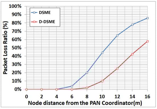 To assess the reliability under different channel conditions, the Log-normal shadowing channel model with  and  was adopted, as these values provide a very harsh channel environment, similar to a realistic industrial context []. Results were obtained increasing the distance of the nodes from the PAN-Coordinator that acts as the sink.