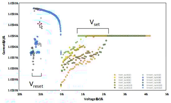 - Ghosh, G.; Orlowski, M.K. Correlation between set and reset voltages in resistive RAM cells. Curr. Appl. Phys. 2015, 15, 1124–1129. [Google Scholar] [CrossRef]