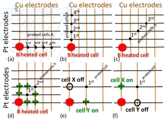 Location of neighbor cells relative to the heated cell marked by a red dot. Initially, the cells are set in an off-state. (a) Heat transport from the heated cell to its neighbors located on the Pt electrode. (b) Heat transport to its neighbors disposed along the Cu electrode. (c) Heat transport to its neighbors located diagonally with respect to the heated cell. (d) Heat transport to its neighbors at diagonal locations with intermediate cells (marked by green crosses) in the on-state. (e) Thermal path from the heated cell to first cell via cell Y. (f) Thermal path from the heated cell to first cell via cell X.