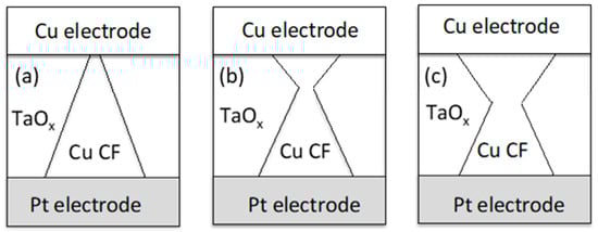 Different geometrical shapes approximating the hypothesized form of a Cu filament: (a) conventionally assumed shape of a truncated cone; (b) an hourglass-shaped filament formed at low Icc; (c) an hourglass-shaped filament formed at high Icc.