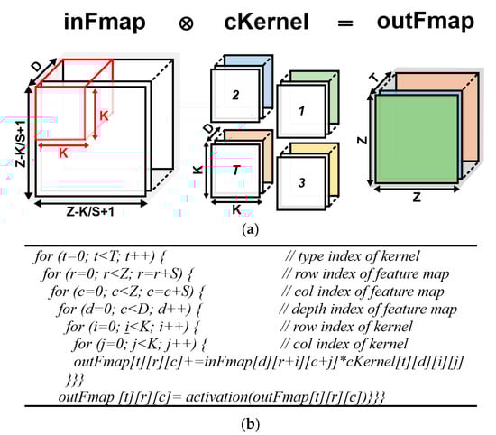 The convolution layer is an essential process in CNN, and it carries out element-wise multiplications between images and filters. Figure 1a presents the set of computations in a convolution layer. The convolution layer receives a D-channel input feature map as an input image. Each input feature map is convolved with K × K × D kernels by shifting the kernel window to generate one pixel in a Z × Z output feature map. The stride of the receptive field is S, and T output features will form the set of input feature maps for the next convolution layer. After output features are generated, they are filtered using an activation function such as sigmoid, tanh, and rectified linear unit (ReLU). Figure 1b shows a pseudo code that describes operations that are carried out in a convolution layer where element-wise multiplications between an input feature map (inFmap) and a convolution kernel (cKernel) are performed to extract features and generate an output feature map (outFmap).